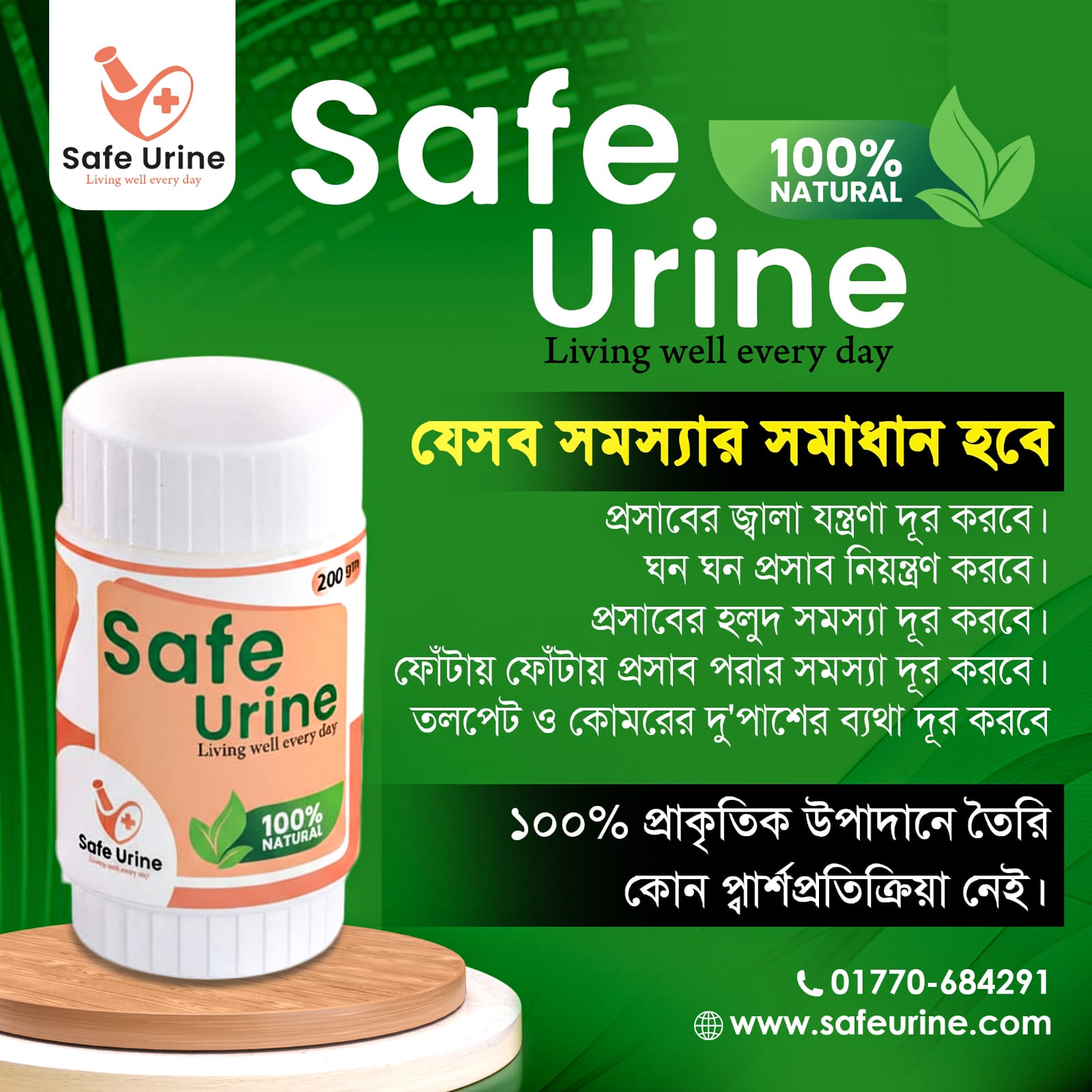আমাদের ''Safe Urine" এবং “ইউরিন গার্ড বটিক” কম্বোটিতে আলকুশি, অশ্বগন্ধা, শিমূল, শতমূল, রেউচিনি, কাতিলা গাম, জিনসেং, তেতুল বীজ, বীর্যমনি, জাফরান, মকরধ্বজ, আকরকরা, মাশরুম, গুলঞ্চ সহ মোট ১৬টি প্রাকৃতিক ও ভেষজ উপাদানের সঠিক অনুপাতে মিশ্রণ ব্যাবহার করা হয়েছে।