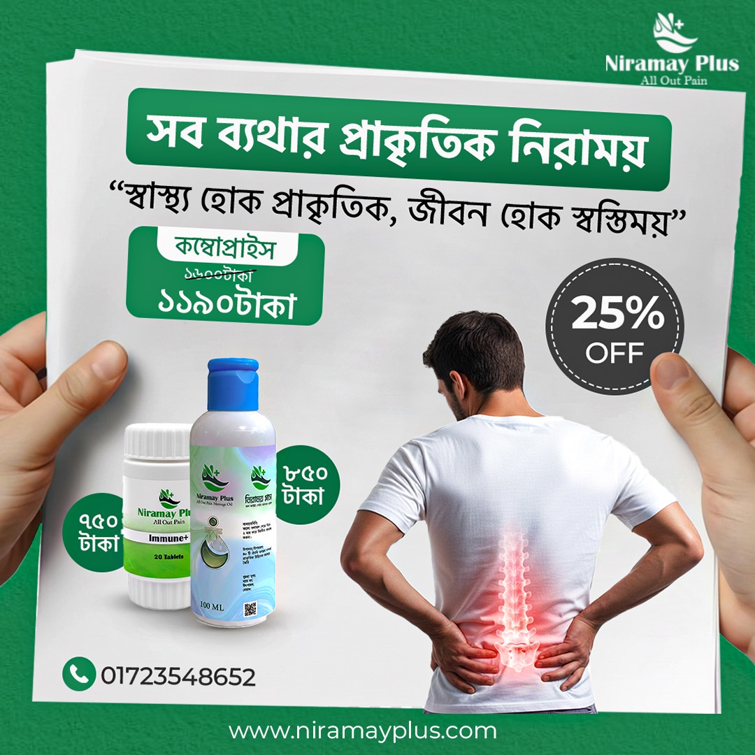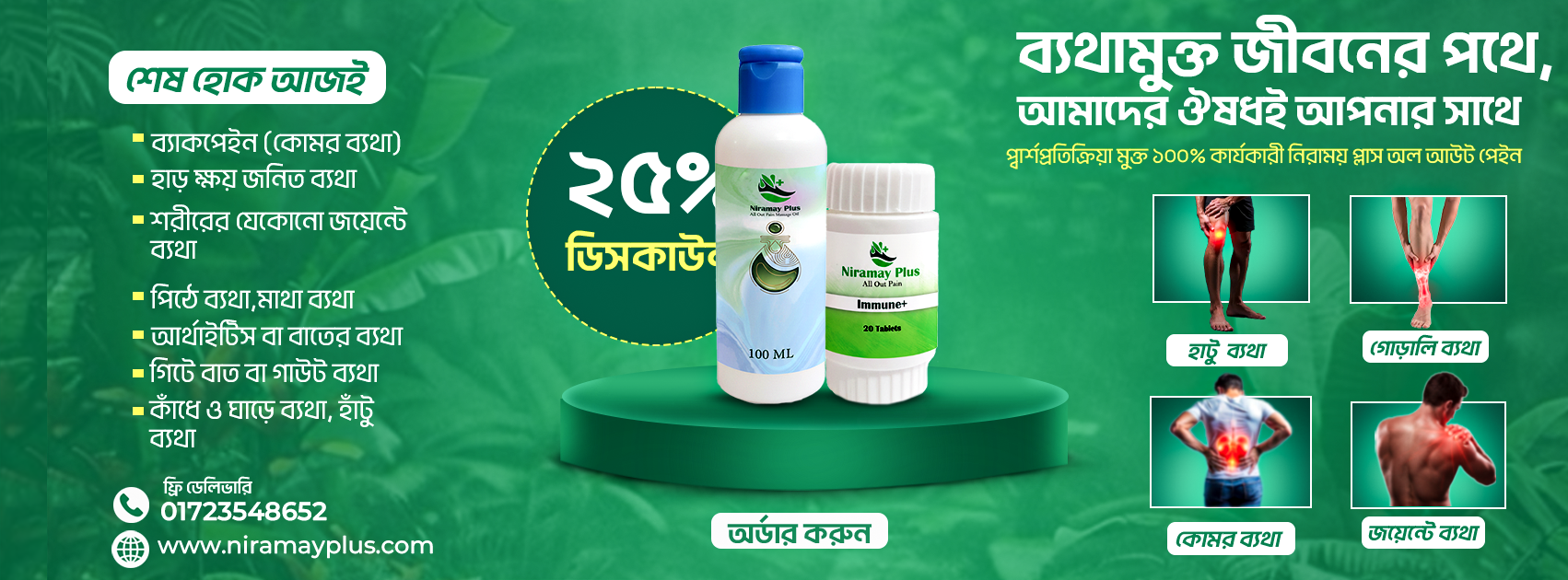 আমাদের Niramay Plus অর্গানিক ট্যাবলেট সেবন এবং সাথে Niramay plus অর্গানিক তেল ব্যাবহারে ৭-১০ দিন নিয়মিত ব্যবহার করলে হাটু ব্যথা, কাধ ব্যথা, বাত ব্যথা, কোমর ব্যথা সহ সকল নতুন পুরাতুন ব্যথা স্থায়ী ভাবে দূর হবে ইনশাআল্লাহ।